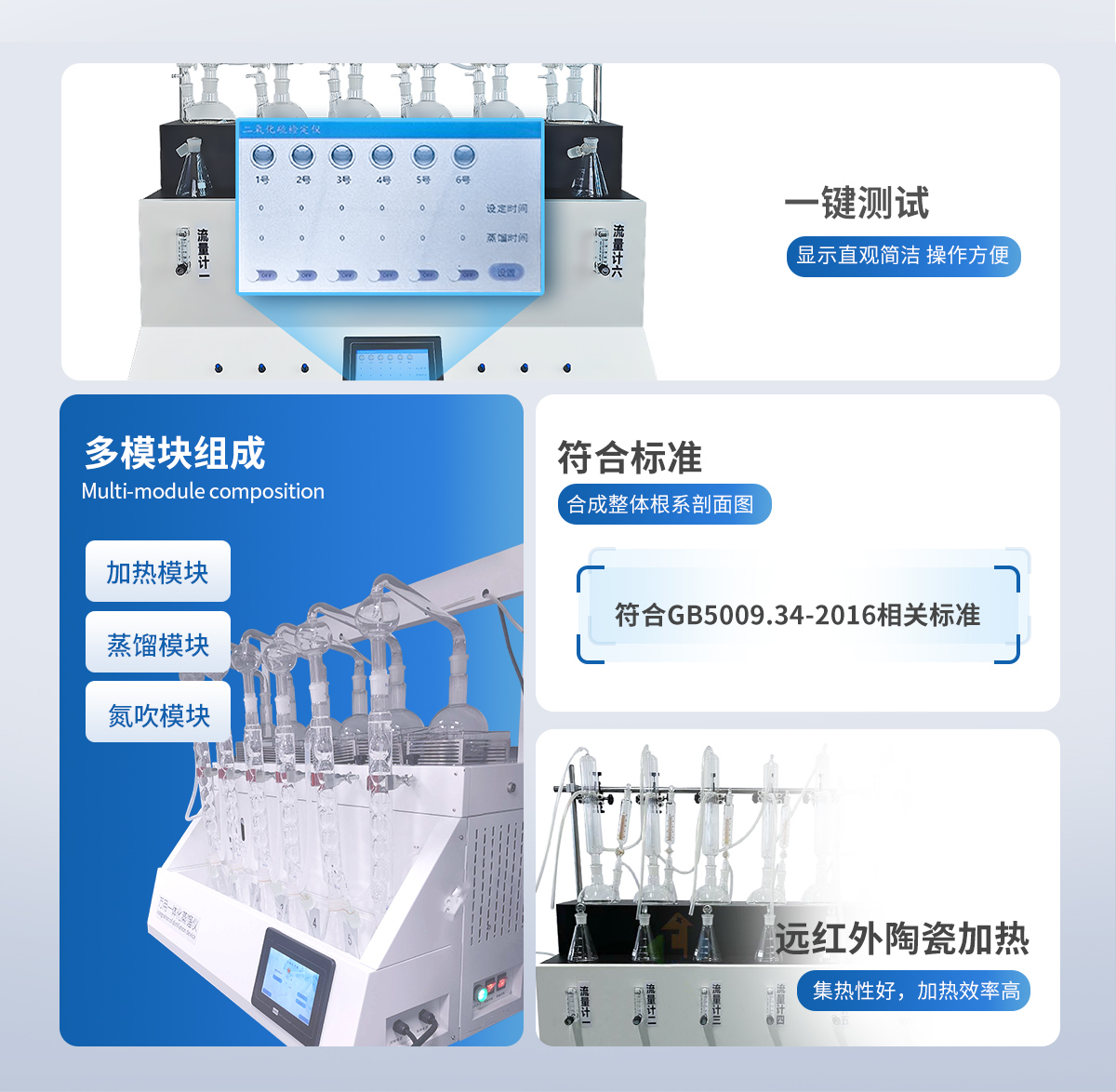 中藥二氧化硫殘留量測(cè)定儀主要由加熱模塊,蒸餾模塊,冷卻循環(huán)水模塊以及氮吹模塊組成。加熱模塊設(shè)置了高,中,低三檔加熱速率控制功能,可實(shí)現(xiàn)加熱效率的**控制面板;蒸餾模塊選用高硼硅材料,耐熱性好,堅(jiān)固耐用;冷卻水循環(huán)系統(tǒng)可選用外置冷卻水循環(huán)機(jī)(內(nèi)置可選),確保冷卻效果。氮吹模塊可外接氮?dú)獍l(fā)生器或氮?dú)怃撈?,并配有高精度氣體流量計(jì),嚴(yán)格控制氮吹速率