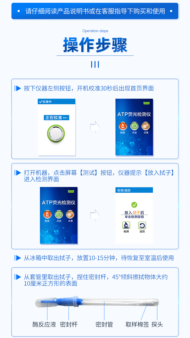 該設(shè)備為全新升級(jí)產(chǎn)品,大屏幕觸摸顯示屏,代替?zhèn)鹘y(tǒng)按鍵。操作采用生物化學(xué)反應(yīng)方法檢測(cè)ATP含量,ATP熒光檢測(cè)儀基于螢火蟲(chóng)發(fā)光原理,利用“熒光素酶—熒光素體系”快速檢測(cè)三磷酸腺苷(ATP)。ATP拭子含有可以裂解細(xì)胞膜的試劑,能將細(xì)胞內(nèi)ATP釋放出來(lái),與試劑中含有的特異性酶發(fā)生反應(yīng),產(chǎn)生光,再用熒光照度計(jì)檢測(cè)發(fā)光值,微生物的數(shù)量與發(fā)光值成正比,由于所有生物活細(xì)胞中含有恒量的ATP,所以ATP含量可以清晰地表明樣品中微生物與其他生物殘余的多少,用于判斷衛(wèi)生狀況。