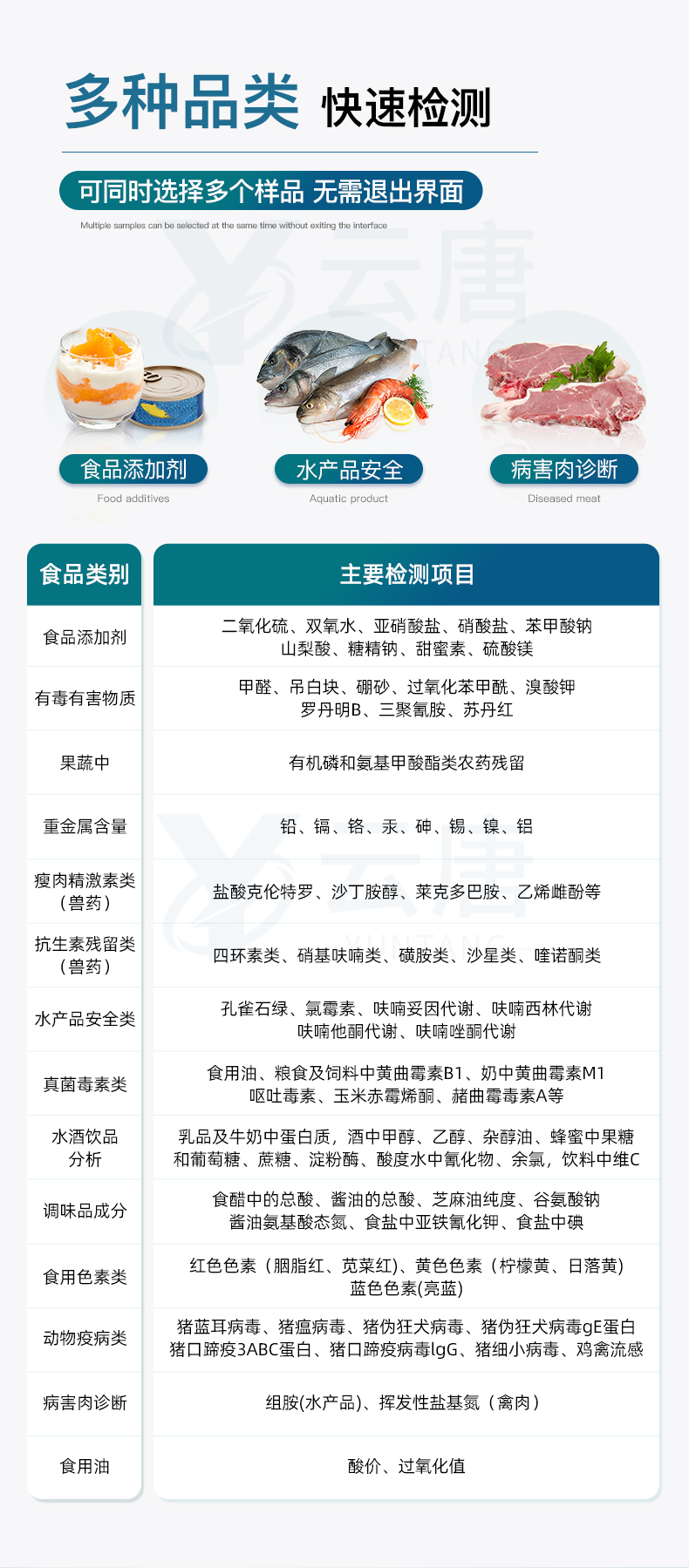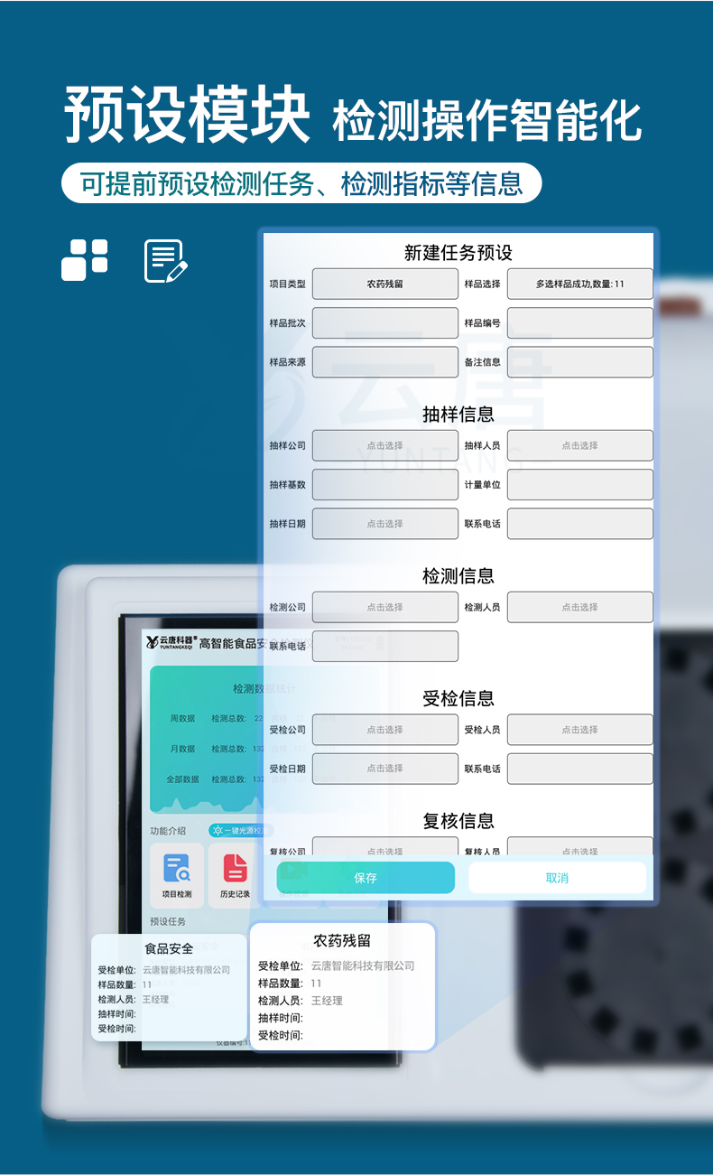 山東云唐智能科技有限公司生產(chǎn)的高智能食品安全檢測儀為集成化食品安全快速檢測分析設(shè)備,采用臺式一體化設(shè)計,可快速檢測200多種食品安全項目,包含非食用化學(xué)物質(zhì)、濫用食品添加劑、農(nóng)藥殘留、重金屬、病害肉、營養(yǎng)強化劑等項目的定量檢測。