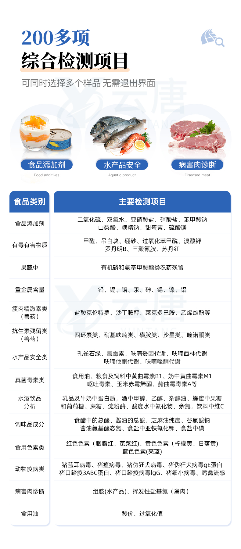 8、抗生素殘留類(獸藥):四環(huán)素類、硝基呋喃類、磺胺類、β-興奮劑類、沙星類、磺胺類、喹諾酮類,甲砜霉素,氟苯尼考,金剛烷胺、替米考星、慶大霉素、林可霉素、鏈霉素、恩諾沙星、環(huán)丙沙星、頭孢啦啶、青霉素、阿莫西林、孕酮、甲基睪酮、氟甲喹、三聚氰胺等;