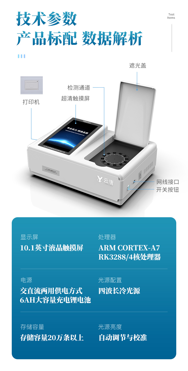 山東云唐智能科技有限公司生產(chǎn)的果蔬肉類檢測儀,采用臺式一體化設(shè)計,可快速檢測幾十種項目,包含各種蔬菜水果中有機(jī)磷和氨基甲酸酯類農(nóng)藥殘留,病害肉診斷:肉中組胺、揮發(fā)性鹽基氮;各種肉食品中瘦肉精激素類殘留、抗生素、獸藥殘留等現(xiàn)場的定性定量檢測。