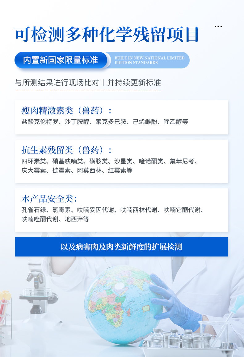 3.☆檢測項(xiàng)目:可檢測農(nóng)藥殘留、食品添加劑、色素、可現(xiàn)場快速檢測農(nóng)藥殘留、鹽酸克倫特羅、沙丁胺醇、萊克多巴胺、四環(huán)素類、硝基呋喃類、磺胺類、沙星類、氯霉素、孔雀石綠磺胺類,并且可以連接食品安全監(jiān)控系統(tǒng)。