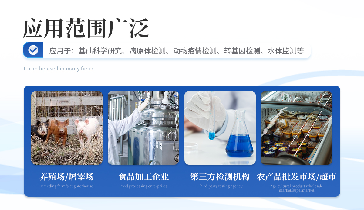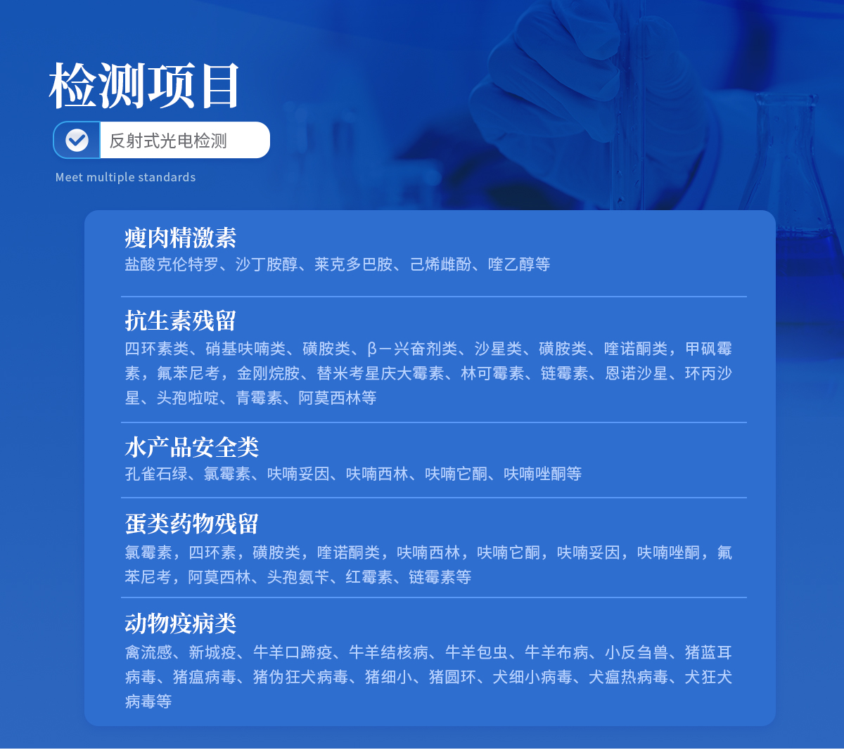 | 1、 瘦肉精激素:鹽酸克倫特羅、沙丁胺醇、萊克多巴胺、己烯雌酚、喹乙醇等 | 2、 抗生素殘留:四環(huán)素類、硝基呋喃類、磺胺類、β-興奮劑類、沙星類、磺胺類、喹諾酮類,甲砜霉素,氟苯尼考,金剛烷胺、替米考星、慶大霉素、林可霉素、鏈霉素、恩諾沙星、環(huán)丙沙星、頭孢啦啶、青霉素、阿莫西林等 | 3、 水產(chǎn)品安全類:孔雀石綠、氯霉素、呋喃妥因、呋喃西林、呋喃它酮、呋喃唑酮等 | 4、 蛋類藥物殘留 氯霉素,四環(huán)素,磺胺類,喹諾酮類,呋喃西林,呋喃它酮,呋喃妥因,呋喃唑酮,氟苯尼考,阿莫西林、頭孢氨芐、紅霉素、鏈霉素等 | 5、 動物疫病類:禽流感、新城疫、牛羊口蹄疫、牛羊結(jié)核病、牛羊包蟲、牛羊布病、小反芻獸、豬藍(lán)耳病毒、豬瘟病毒、豬偽狂犬病毒、豬細(xì)小、豬圓環(huán)、犬細(xì)小病毒、犬瘟熱病毒、犬狂犬病毒等 |